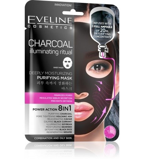 - A deeply purifying Korean mask on the fabric, soaked with 20ml detoxifying serum, rich in active carbon, volcanic dust, caviar, blackcurrant extract, black soy, algae, black rice and sesame.