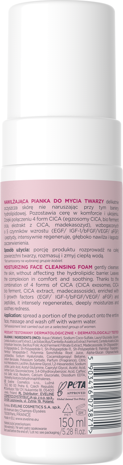 - Cica skin moisturizing foam effectively cleanses the skin without damaging its hydrolipid barrier. Thanks to the combination of Cica extracts, growth factors and peptides, it soothes irritations.