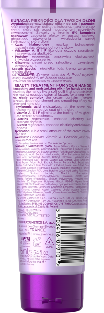 - Hand and nail elixir with hyaluronic acid, vitamins and proteins provides immediate hydration and relief for dry skin.
