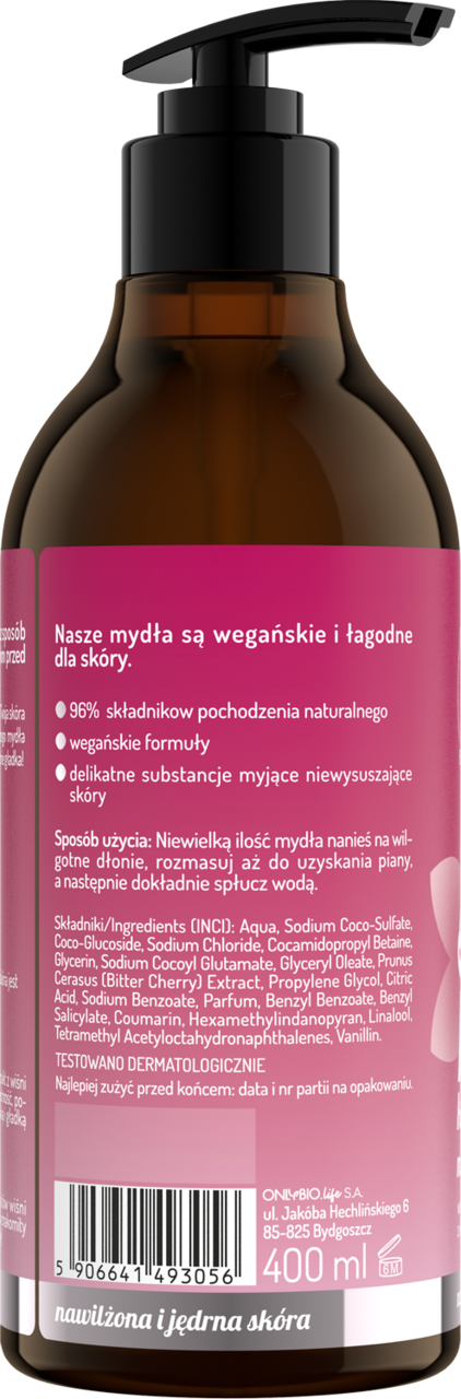 - Sakura Cherry Blossom Liquid Hand Soap contains a vegan formula and natural cleansing substances. Cherry blossom extract improves hydration and firmness, leaving the skin soft and smooth to the touch.