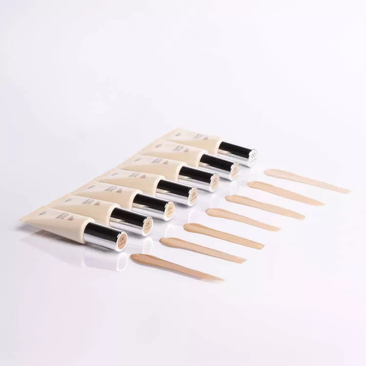 Spread on the skin of the face and neck using a sponge or foundation brush, gently pat with your fingers until the appropriate level of coverage is obtained.