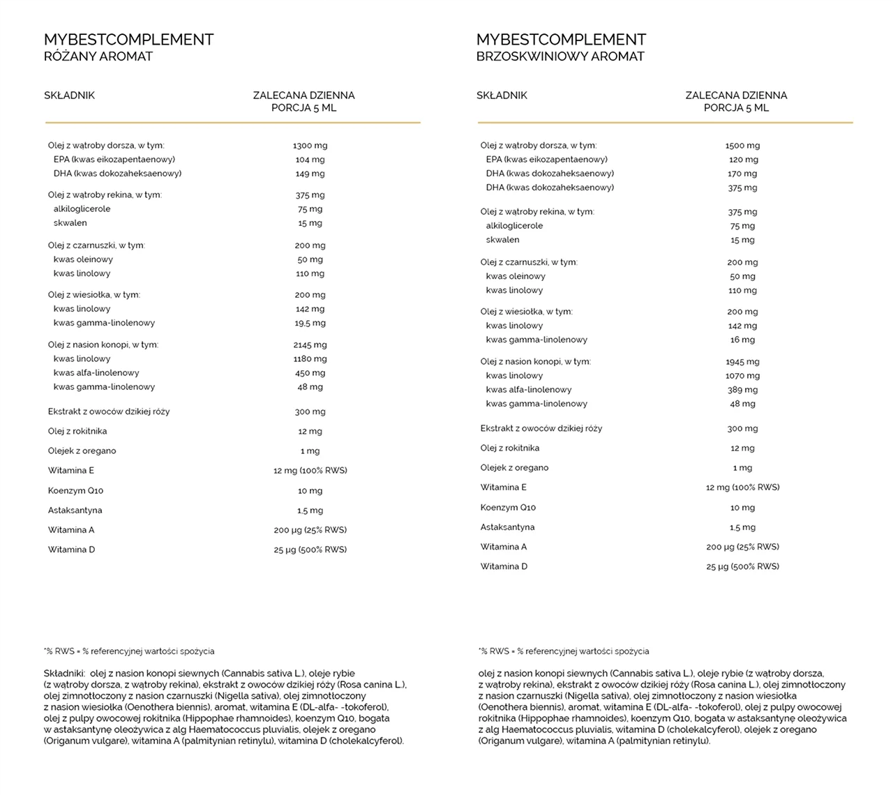 Cod liver oil, including EPA (eicosapentaenoic acid), DHA (docosahexaenoic acid), Shark liver oil, including alkylglycerols, squalene, Black cumin oil, including oleic acid, linoleic acid, Evening primrose oil, including linoleic acid, gamma-linolenic acid, Hemp seed oil, including linoleic acid, alpha-linolenic acid, gamma-linolenic acid, Rosehip oil, Sea buckthorn oil, Oregano oil, Vitamin E, Coenzyme Q10, Astaxanthin 5%, Vitamin A, Vitamin D.
