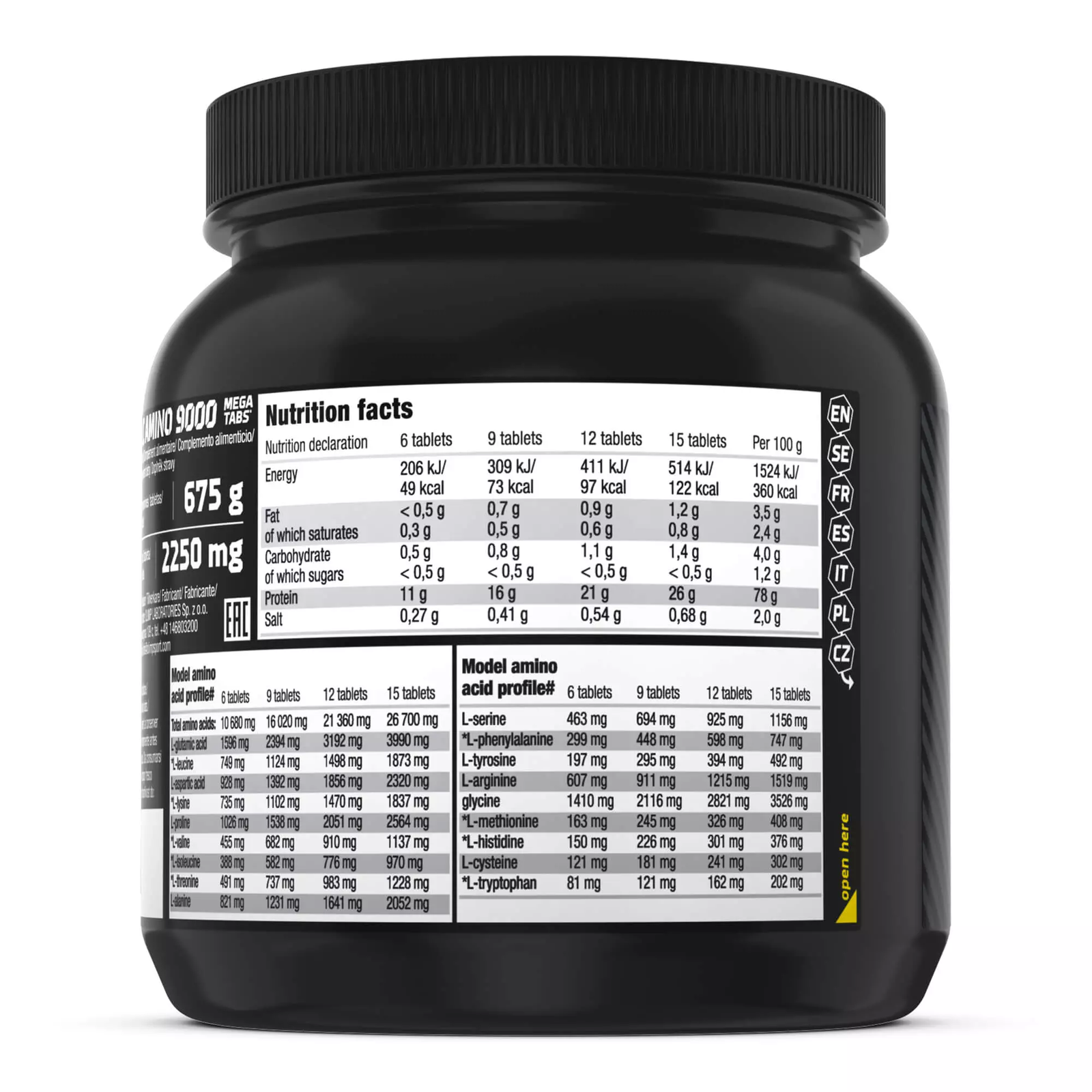 Anabolic Amino 9000 blend (whey protein hydrolysate (from milk), chicken protein hydrolysate), beef protein hydrolysate, bulking agent - calcium carbonate; binding agent - calcium phosphates, anti-caking agents - magnesium salts of fatty acids, silicon dioxide, flavouring.