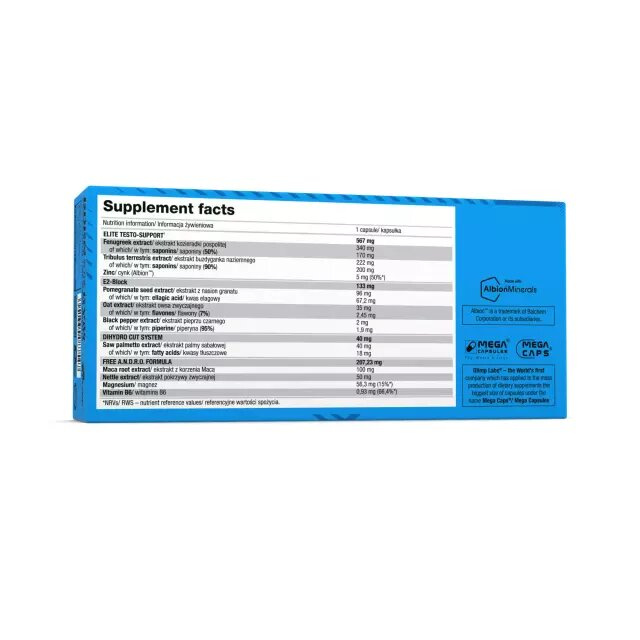 Fenugreek seed extract (Trigonella foenum-graecum L.), Tribulus terrestris fruit extract (Tribulus terrestris L.; 90% saponins), Maca root extract (Lepidium meyenii Walp.), pomegranate seed extract (Punica granatum L.), magnesium malate, magnesium oxide, bulking agent - calcium carbonate; potato starch, nettle herb extract (Urtica dioica L.), saw palmetto fruit extract (Serenoa repens), oat herb extract (Avena sativa L.), zinc bisglycinate (Albion™ zinc amino acid chelate), anti-caking agent - magnesium salts of fatty acids; black pepper fruit extract (Piper nigrum L.), pyridoxine hydrochloride - vit. B6, capsule (gelatin, colour: E 132).