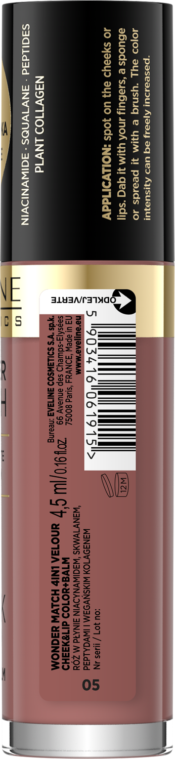 Róż i pomadka w płynie z serii Wonder Match to wyjątkowe połączenie kosmetyku, który nadaje się zarówno na usta, jak i na cerę. Jego pielęgnująca formuła zadba o głębokie nawilżenie. Skóra stanie się przyjemnie aksamitna, odświeżona i zarumieniona. Usta zostaną wypielęgnowane i odżywione. Skwalan, peptydy zadbają o wygładzenie i pielęgnację. Niacynamid zadziała jak warstwa ochronna, która zregeneruje i złagodzi podrażnienia. Wygodny aplikator precyzyjnie umieści róż i pomadkę tam, gdzie potrzebujesz ich najbardziej, a 5 dostępnych kolorów będzie współgrać z różnorodną karnacją.