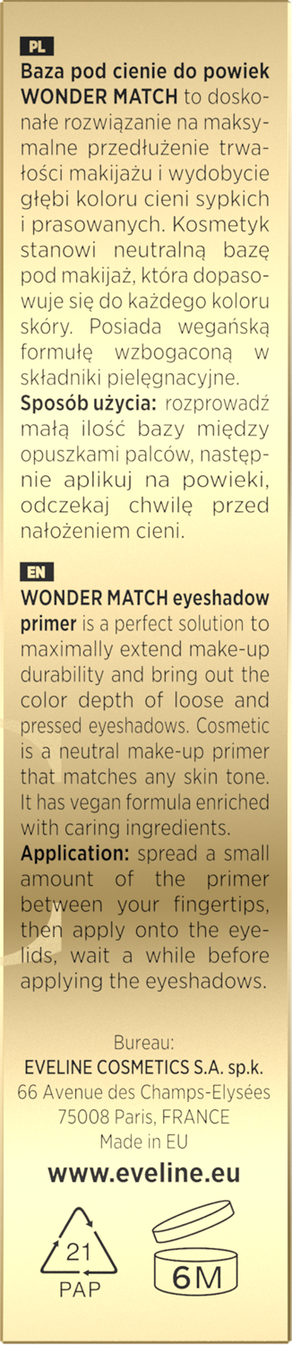 Nałóż niewielką ilość bazy na opuszek palca, rozprowadź ją na powiekach, a następnie odczekaj kilka chwil, zanim nałożysz ulubione cienie. Dzięki temu uzyskasz maksymalnie trwały i intensywny efekt. Produkt świetnie współgra z cieniami z serii Wonder Match.