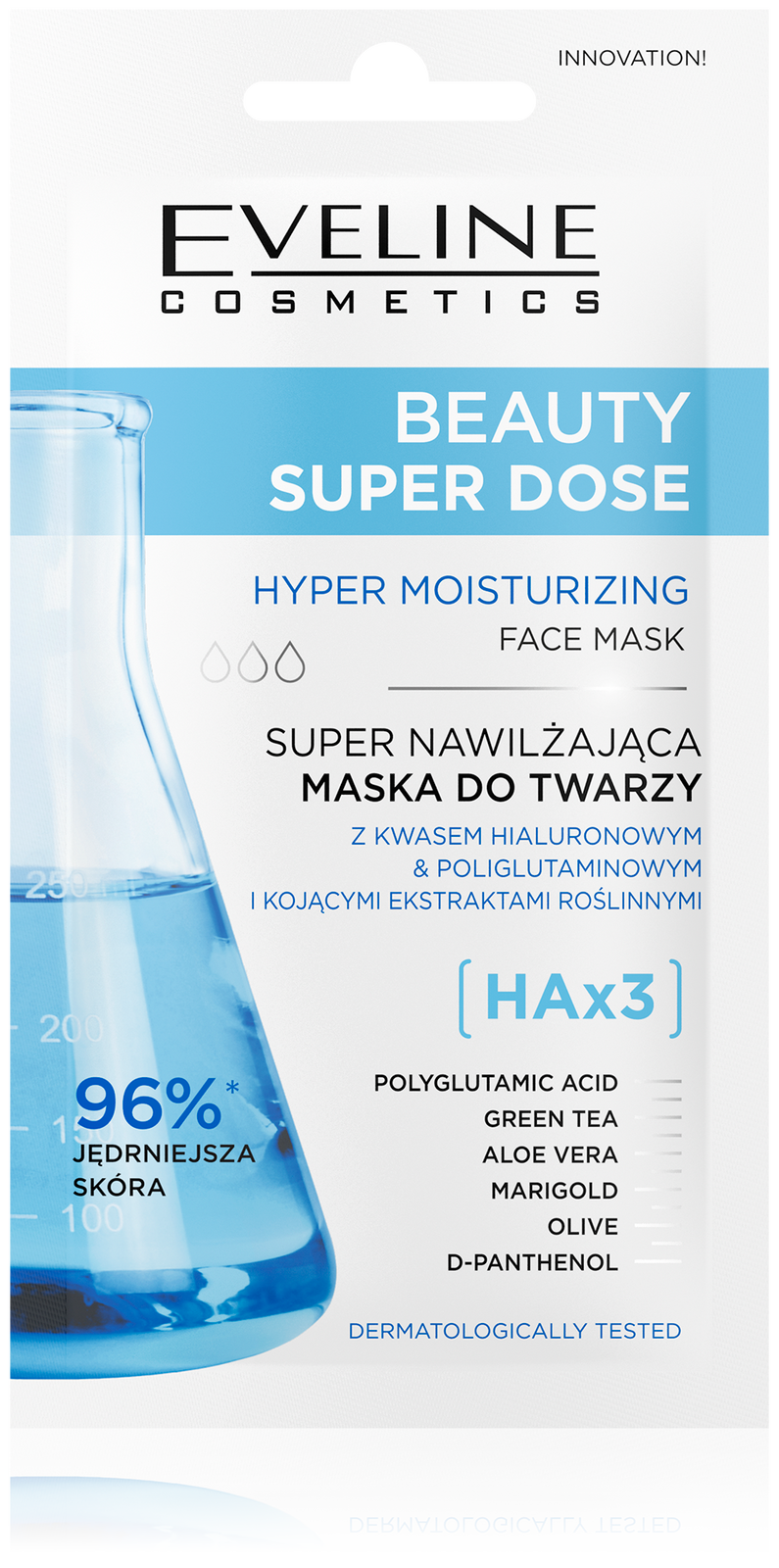 - Super nawilżająca maska do twarzy Eveline Beauty Super Dose Hyper Moisturizing stworzona z myślą o skórze suchej i odwodnionej.