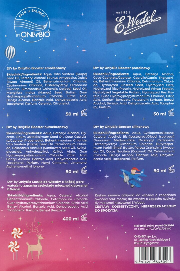 - Zestaw Do It Yourself, boostery: emolientowy, proteinowy, humektantowy, silikonowy + maska do włosów o zapachu czekolady.