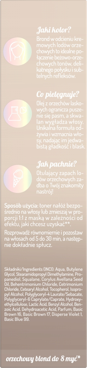 - Poznaj toner do włosów blond, który doskonale odświeża kolor, nadając włosom chłodny, brązowo-beżowy odcień lodów orzechowych. Efekt jest zależny od porowatości i koloru wyjściowego włosów.