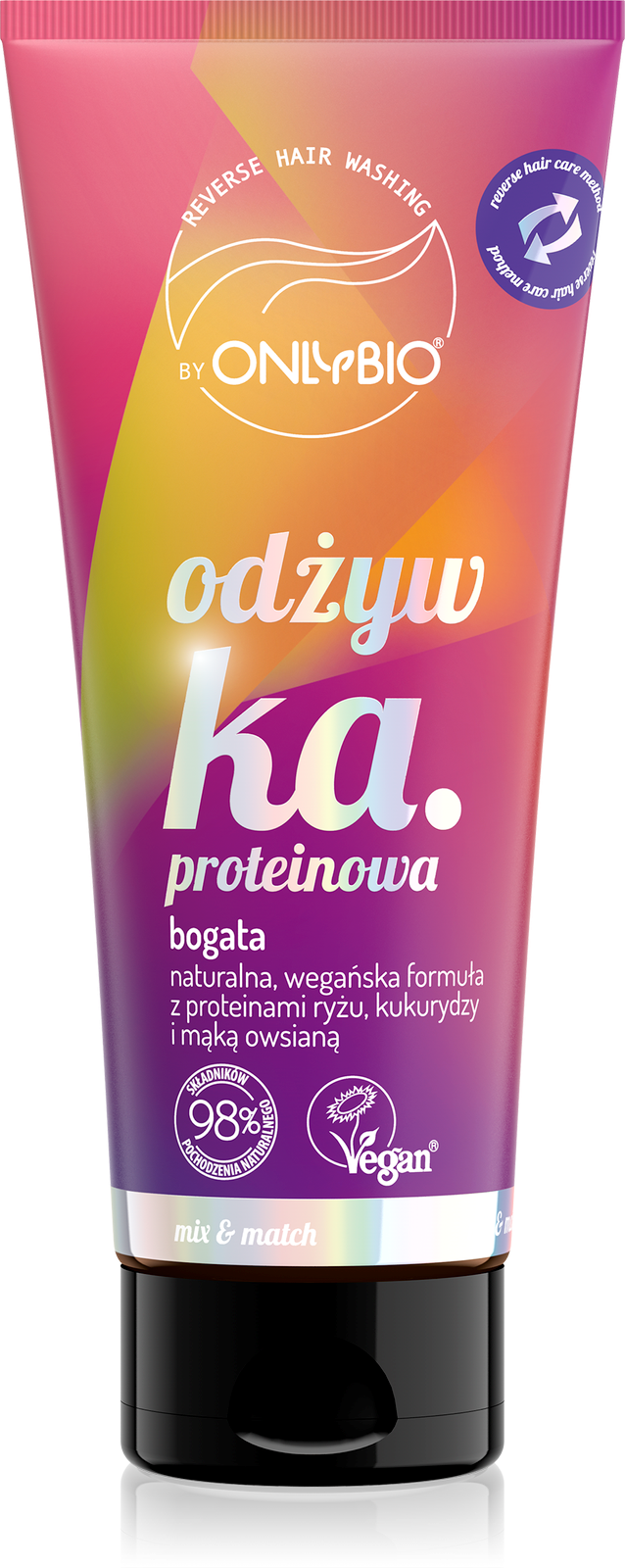 - Wegańska odżywka proteinowa z serii Reverse hair washing od Onlybio zawiera aż 98% składników pochodzenia naturalnego, dbających o wygląd i kondycję kosmyków.
