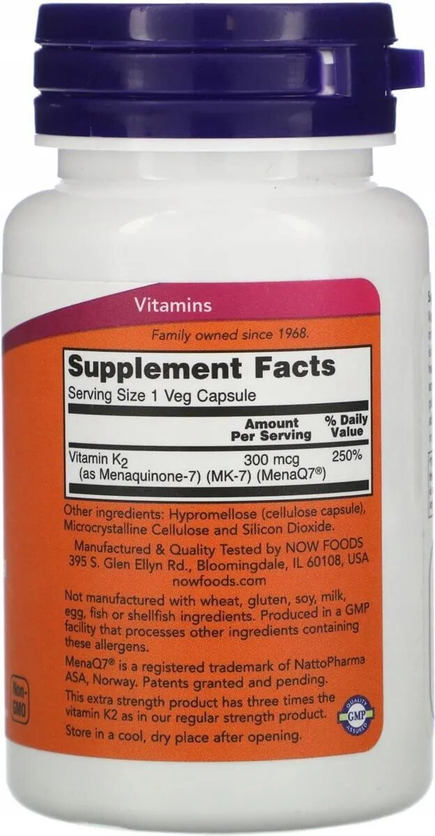 Witamina K – menachinon (z natto – soja bez GMO), subst. wypełniająca – mąka ryżowa, materiał kapsułki – celuloza, subst. przeciwutleniająca – palmitynian askorbylu, subst. przeciwzbrylająca – tlenek krzemu.