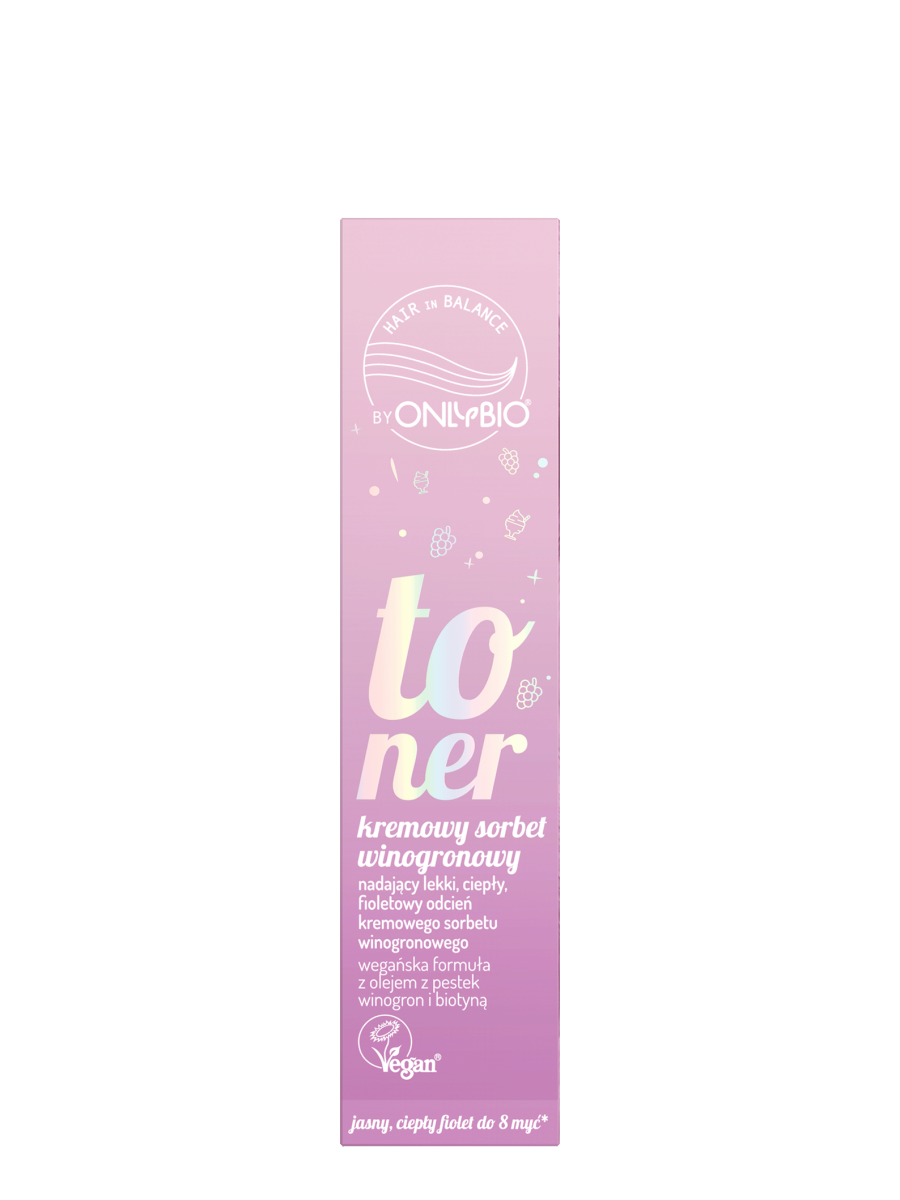 • Toner Kremowy Sorbet Winogronowy – pastelowy fiolet z efektem blasku. Toner Kremowy Sorbet Winogronowy OnlyBio to idealny wybór dla miłośniczek ciepłych, pastelowych blondów z nutą fioletu i eleganckim połyskiem.
