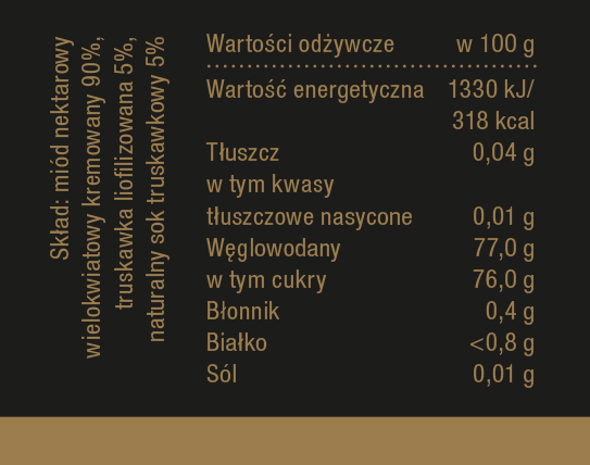 Naturalny miód nektarowy wielokwiatowy kremowany 90%, liofilizowana truskawka 5%, naturalny sok truskawkowy 5%.