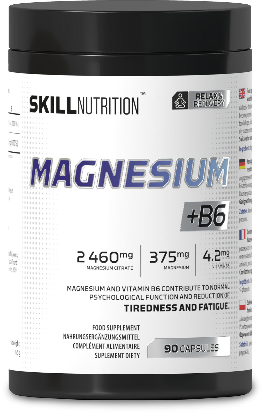 - Skill Nutrition Magnez + B6 to suplement diety łączący cytrynian magnezu z witaminą B6 w opakowaniu zawierającym 90 kapsułek. Produkt wspiera prawidłowe funkcjonowanie układu nerwowego oraz przyczynia się do zmniejszenia uczucia zmęczenia i znużenia.